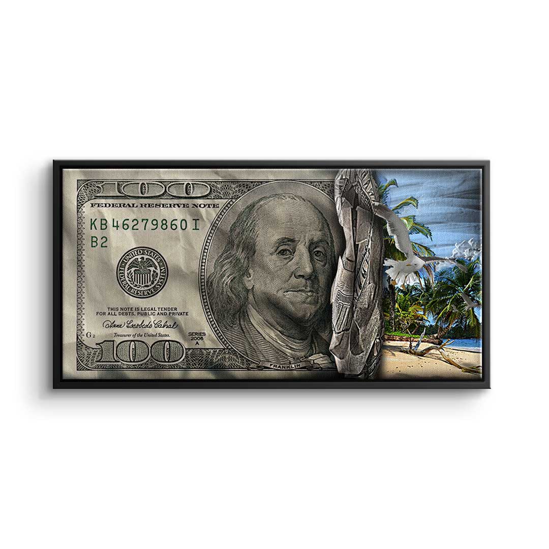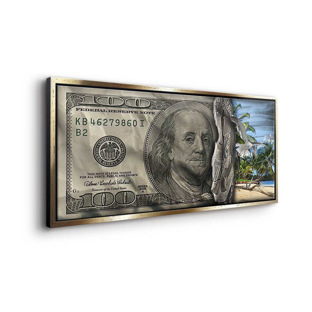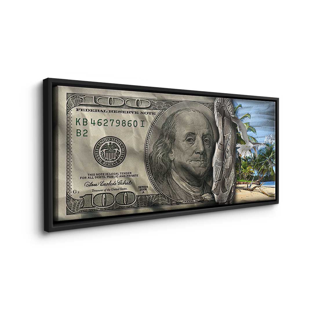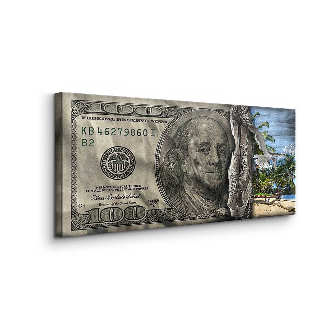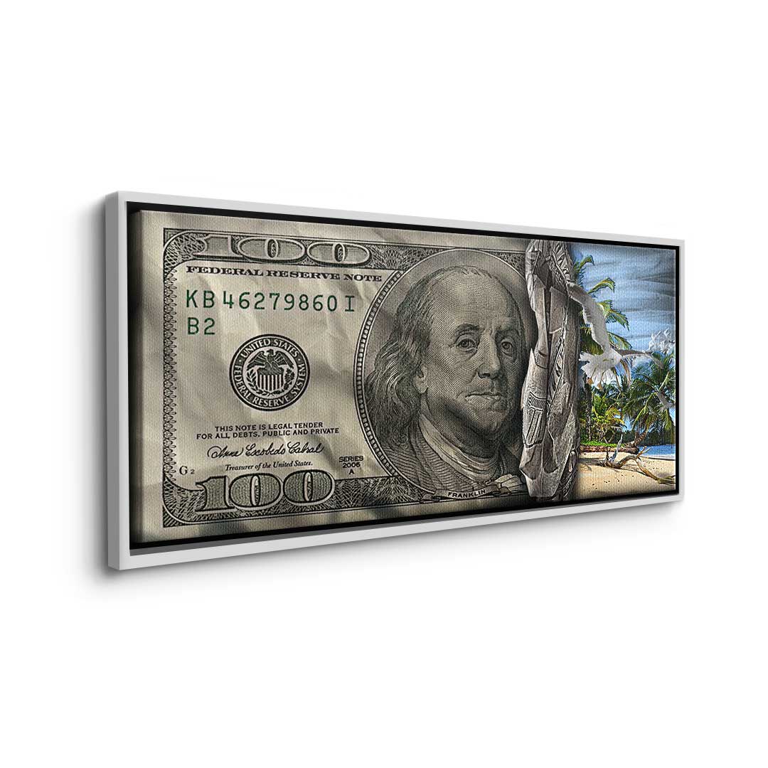 DOTCOMCANVAS® Premium Canvas Print featuring a 30 Dollar Bill design and a beach scene in green, blue, and gray. Tropical Vibes - Keep your goal in sight!