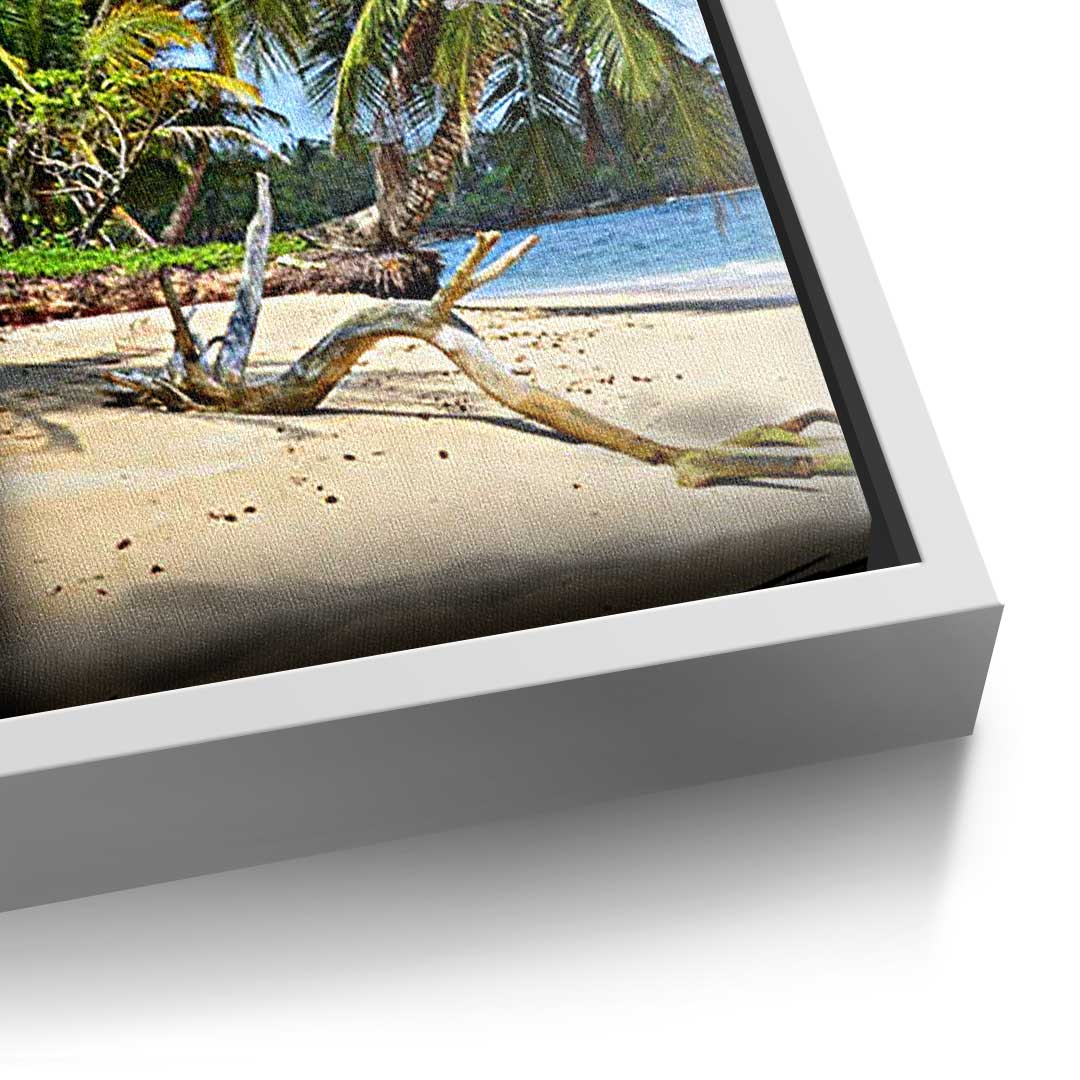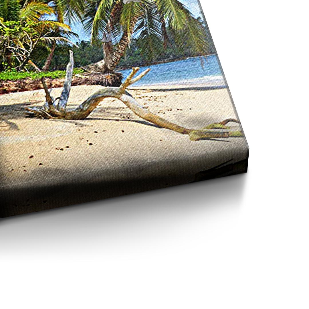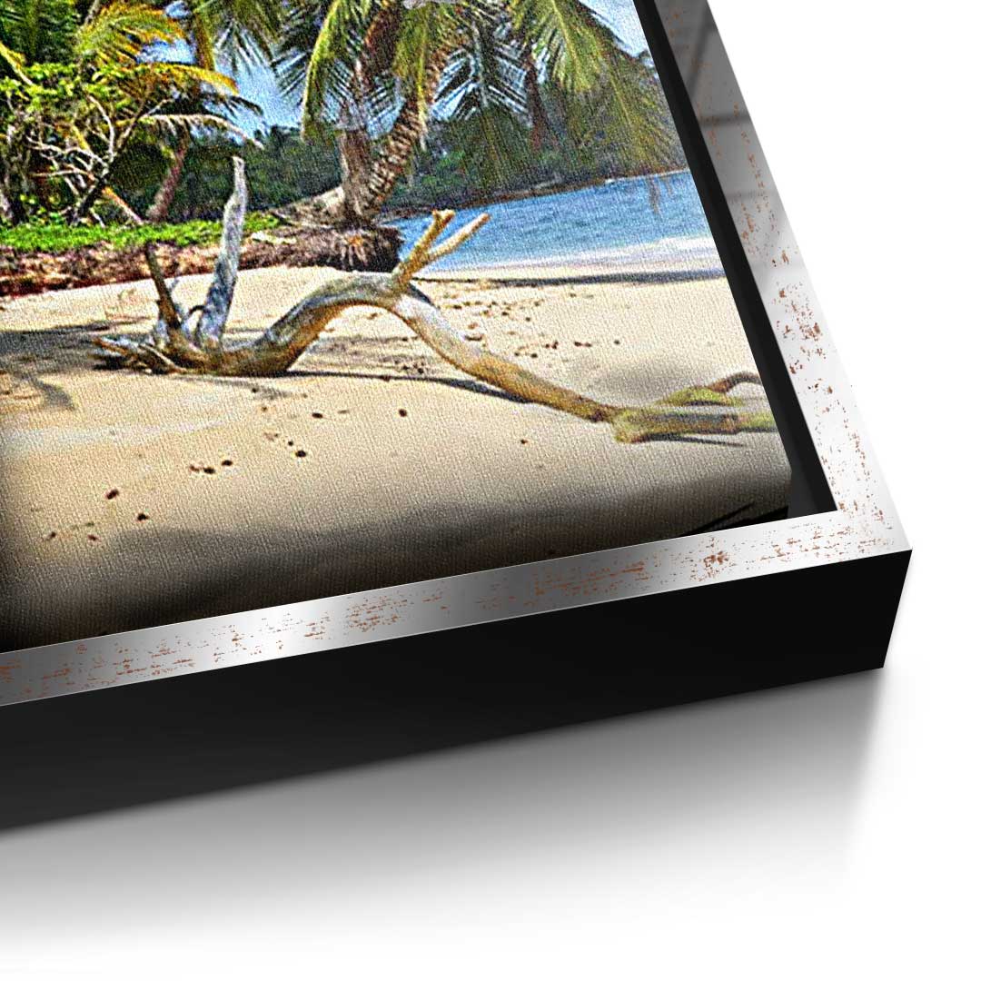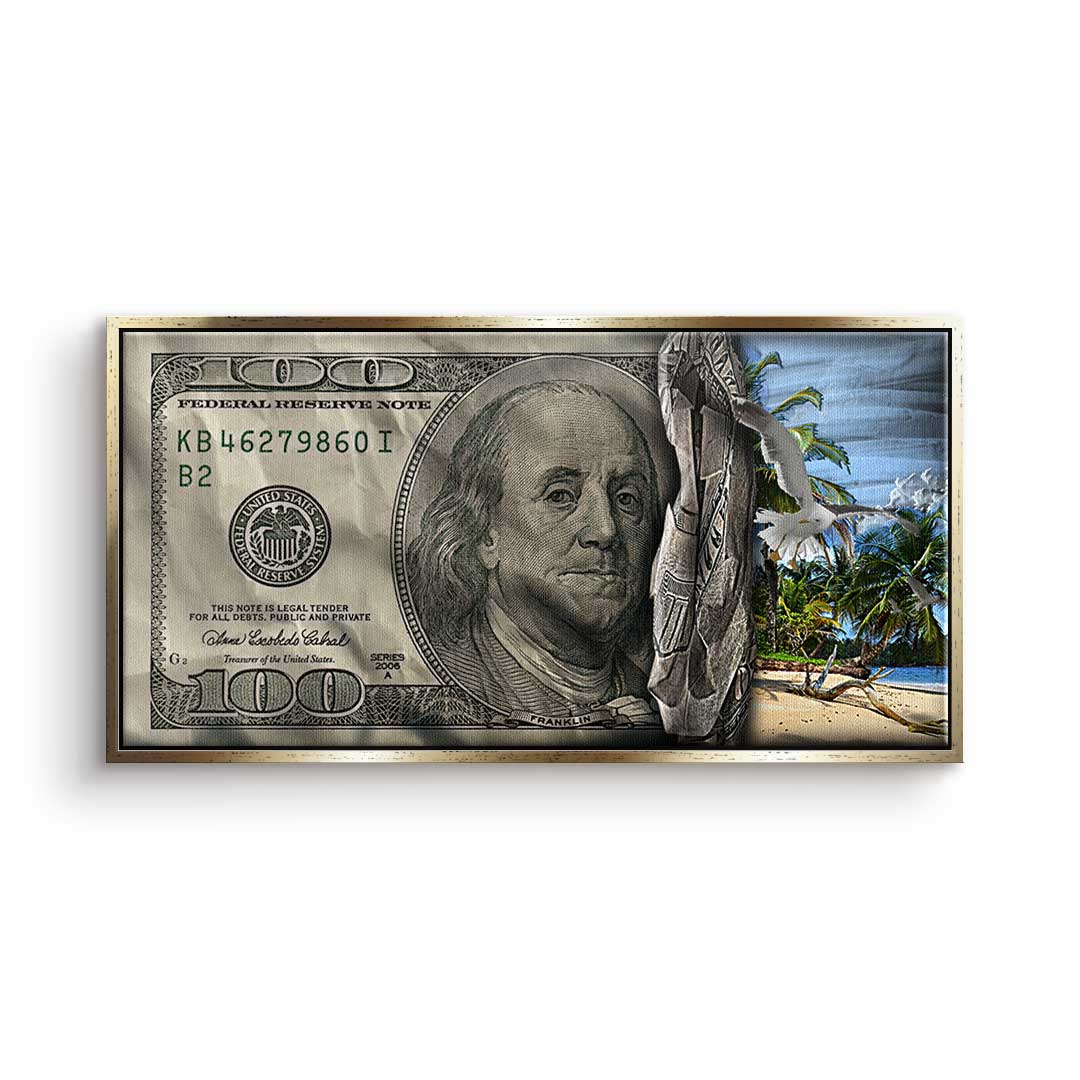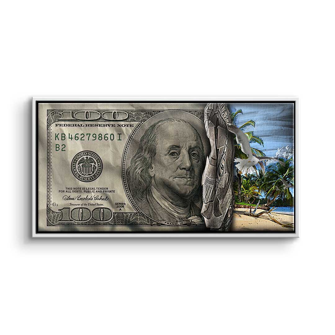 DOTCOMCANVAS® Premium Canvas Print featuring a 30 Dollar Bill design and a beach scene in green, blue, and gray. Tropical Vibes - Keep your goal in sight!