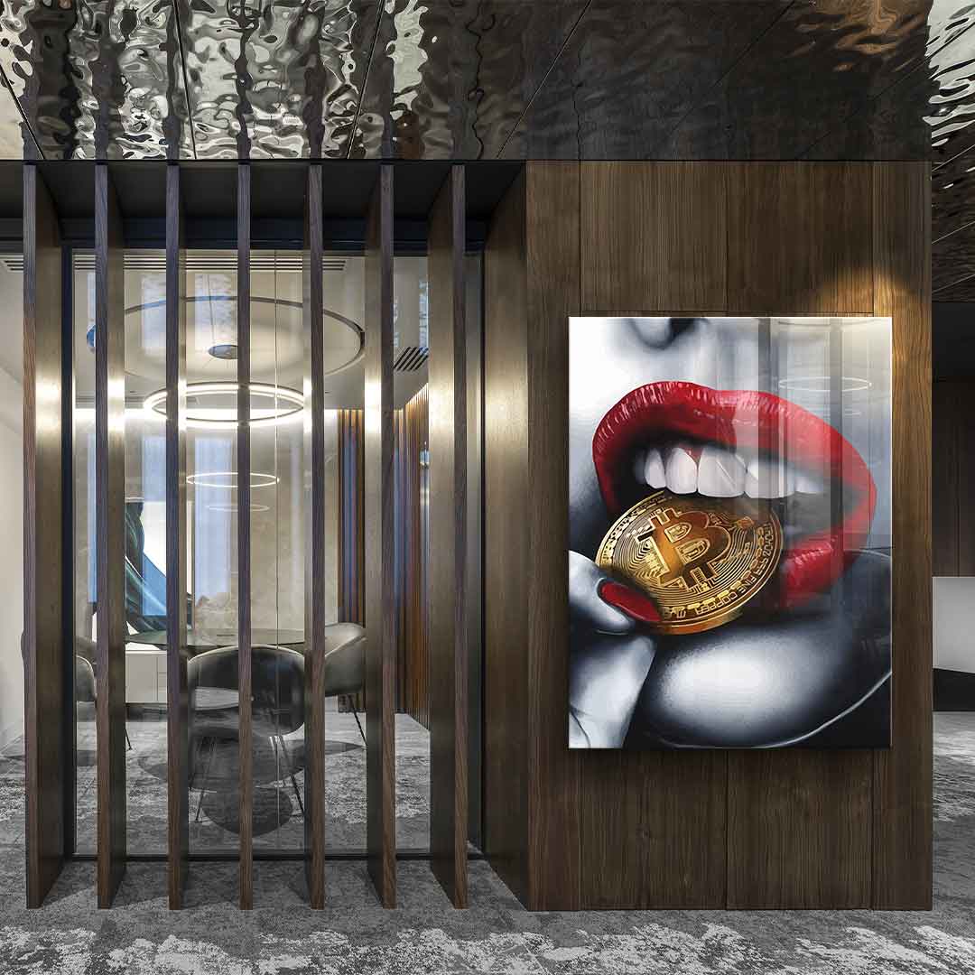DOTCOMCANVAS® Premium Acrylic Glass Picture with Bitcoin Girl Motif.