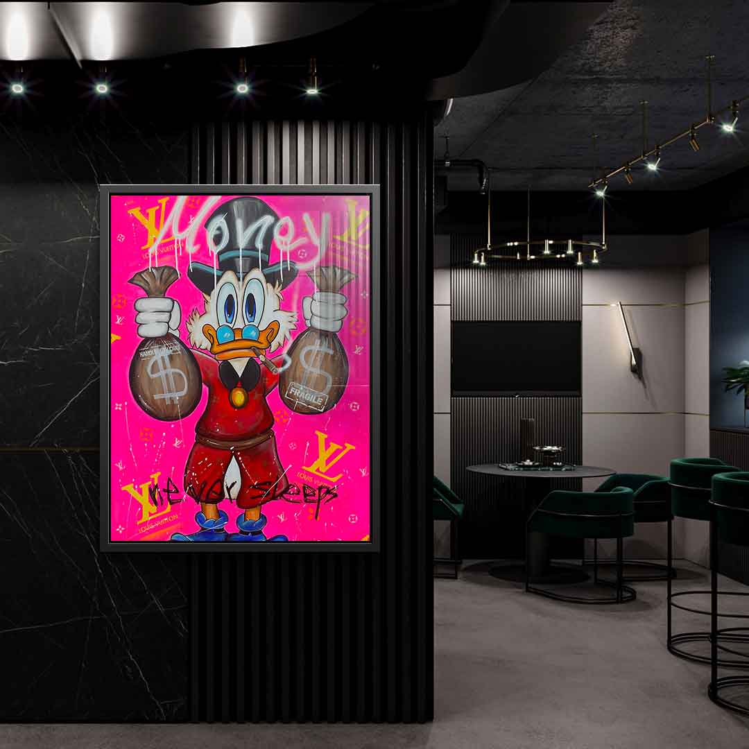 DOTCOMCANVAS® Premium Acrylic Glass Picture with Pink Money Never Sleeps Motif.