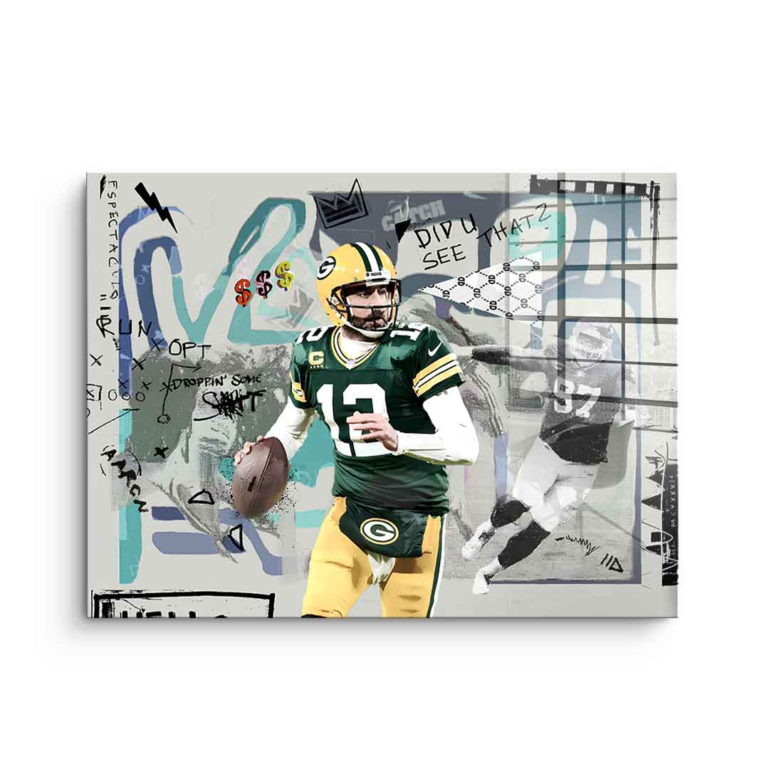 DOTCOMCANVAS® Premium Acrylic Glass Picture featuring Aaron Rodgers as quarterback of the NFL Green Bay Packers.