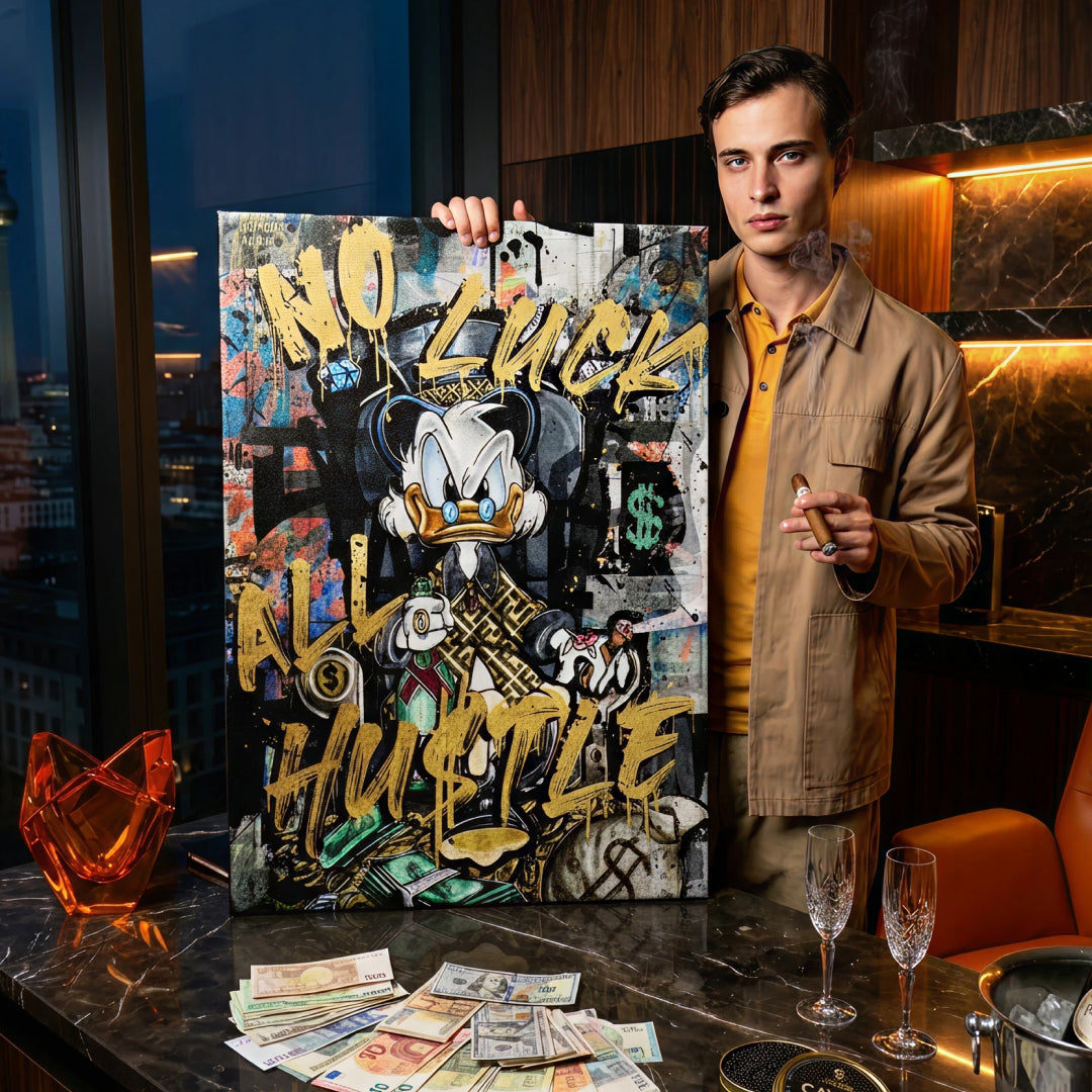 As successor to "Royal Duck." Here, champagne is raised in the air in a dominant style, demonstrating power. The image is primarily striking due to the combination of gold and numerous other color accents. The saying "No Luck All Hustle" It reflects the new era and the focus on one's own goals. The premium canvas is stretched on a high-quality, solid stretcher frame. Ready to hang.