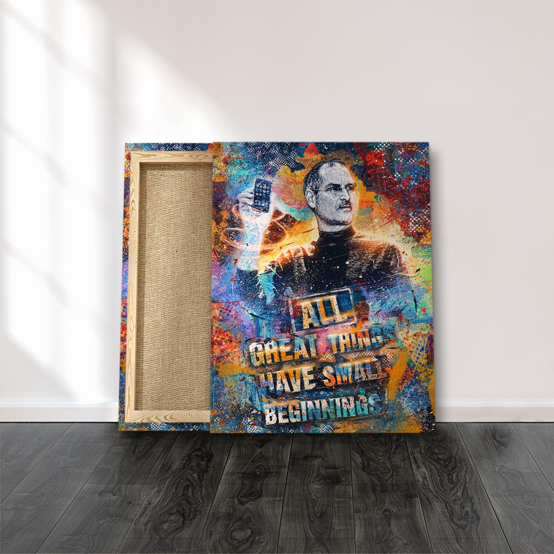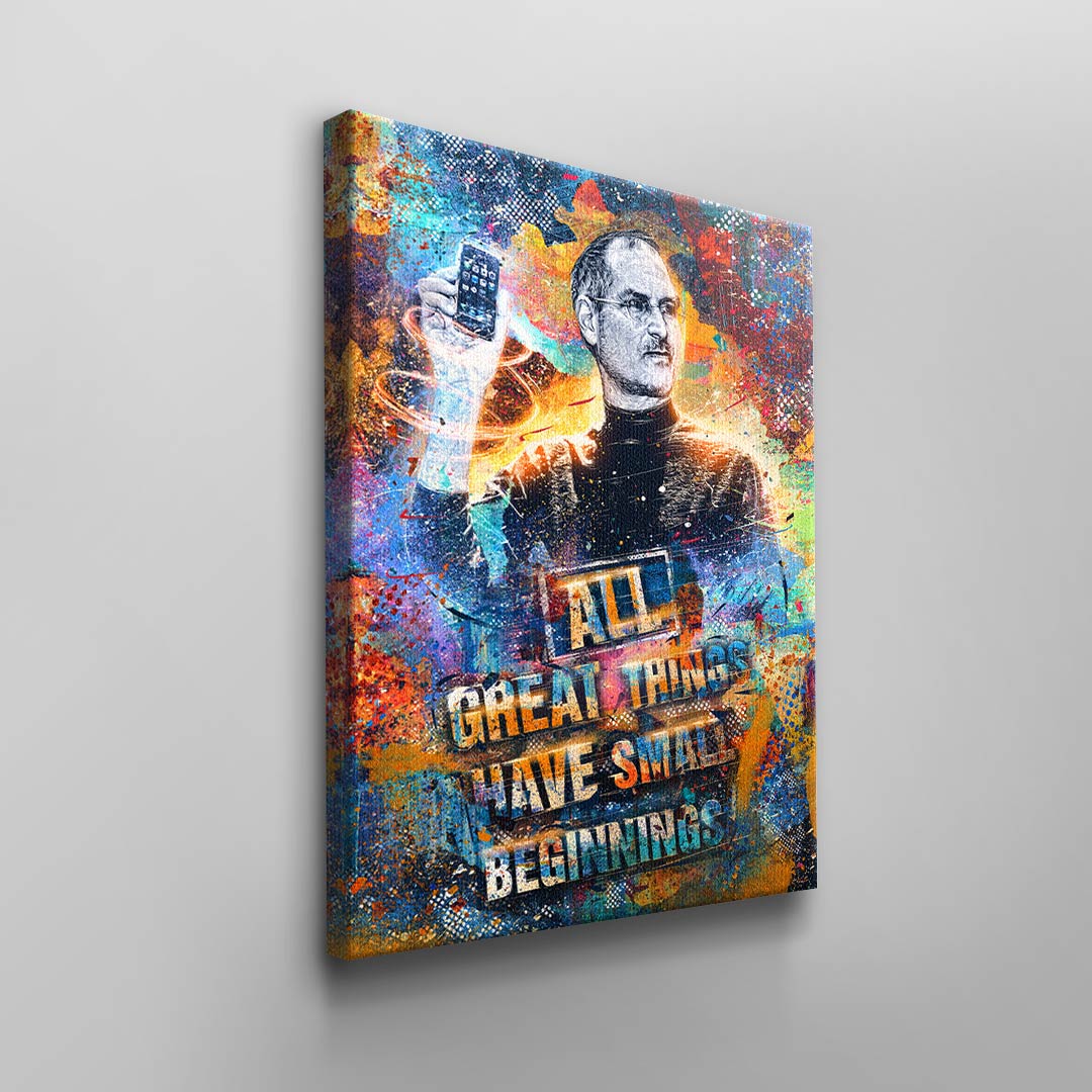 No matter which person you associate with success, they weren't always where they are today. Even your role models started out very small. Often, extremely small indeed. The best example of this is Steve Jobs, who is featured on our business wall art "All Great Things Have Small Beginnings." Initially working as a two-person team in a garage, Steve Jobs and his team worked their way up to the global success we know and appreciate today. You, too, surely have a vision you want to make a reality. With such a big undertaking, it's beneficial to have support for self-motivation. That's precisely what this wall art is designed for! Thanks to its modern colors and timeless message, this canvas is perfect as wall decor for your office or home. Let yourself be inspired!