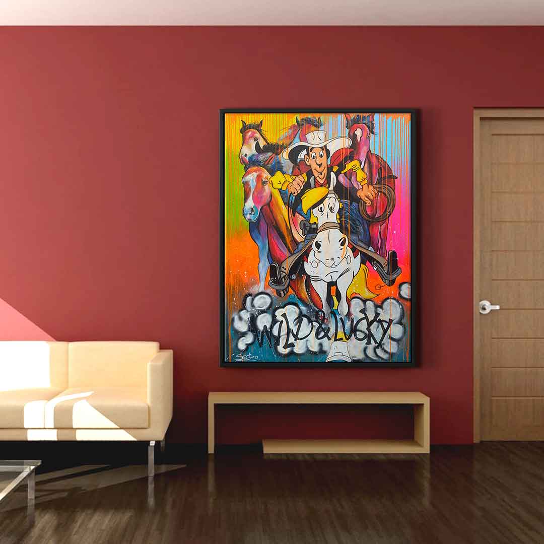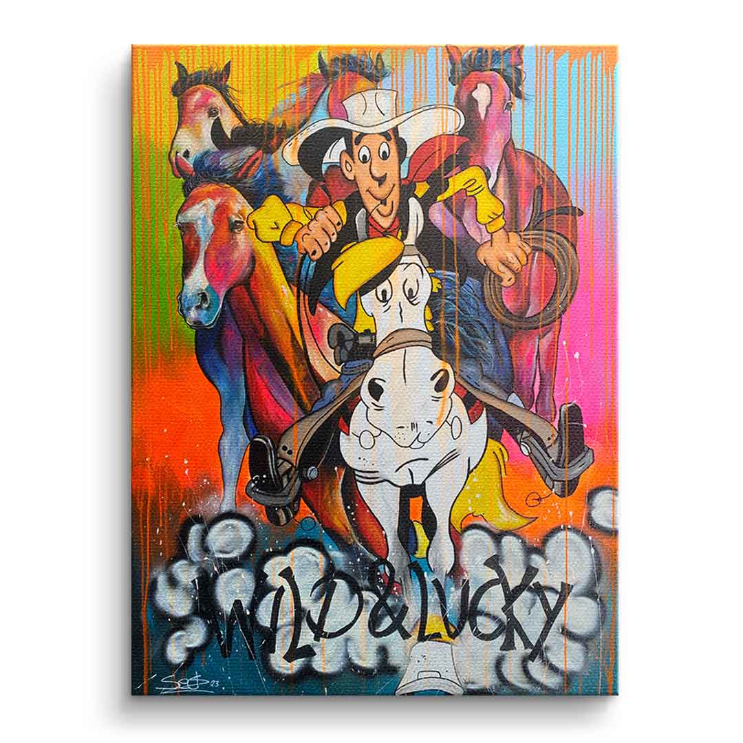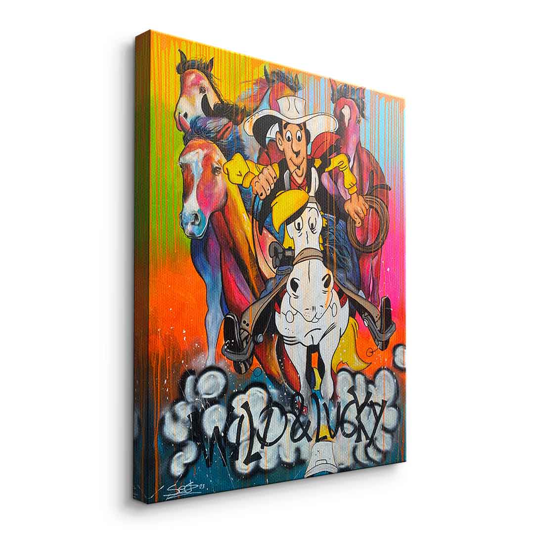 DOTCOMCANVAS® Premium Canvas Print featuring Lucky Luke and his horse Jolly Jumper in comic/cartoon style.