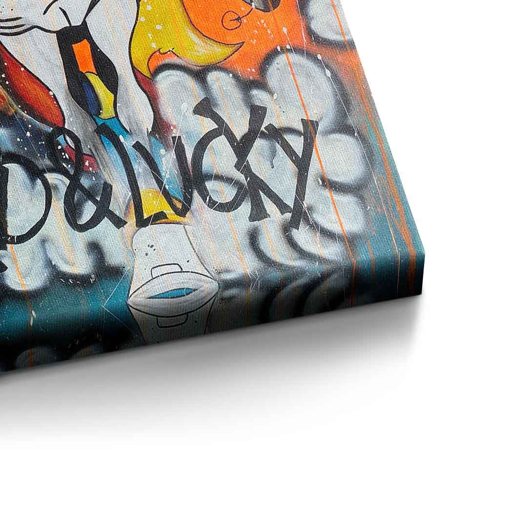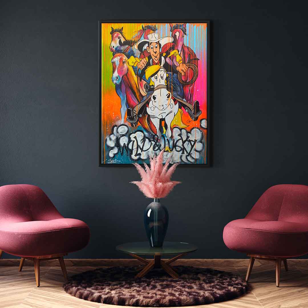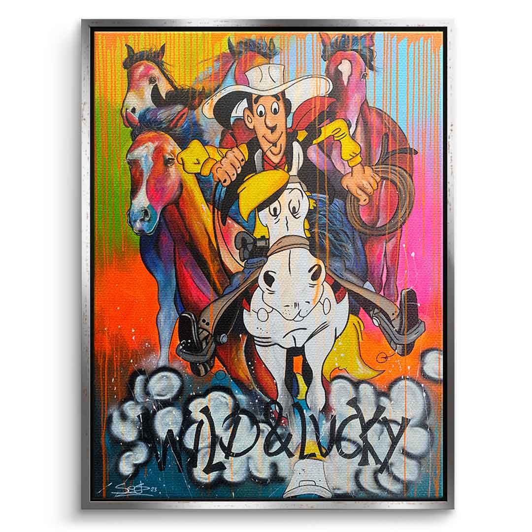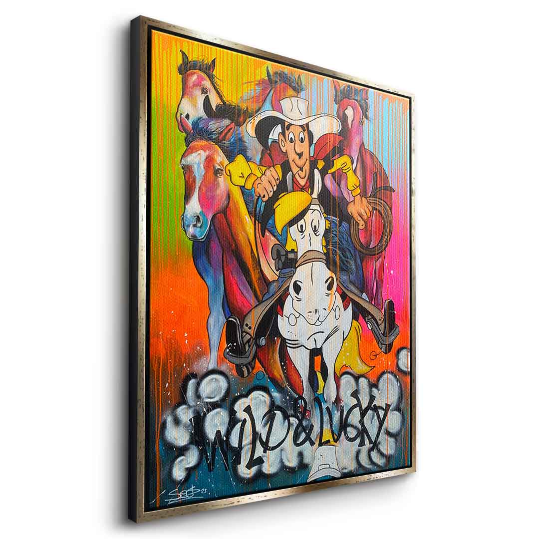 DOTCOMCANVAS® Premium Canvas Print featuring Lucky Luke and his horse Jolly Jumper in comic/cartoon style.