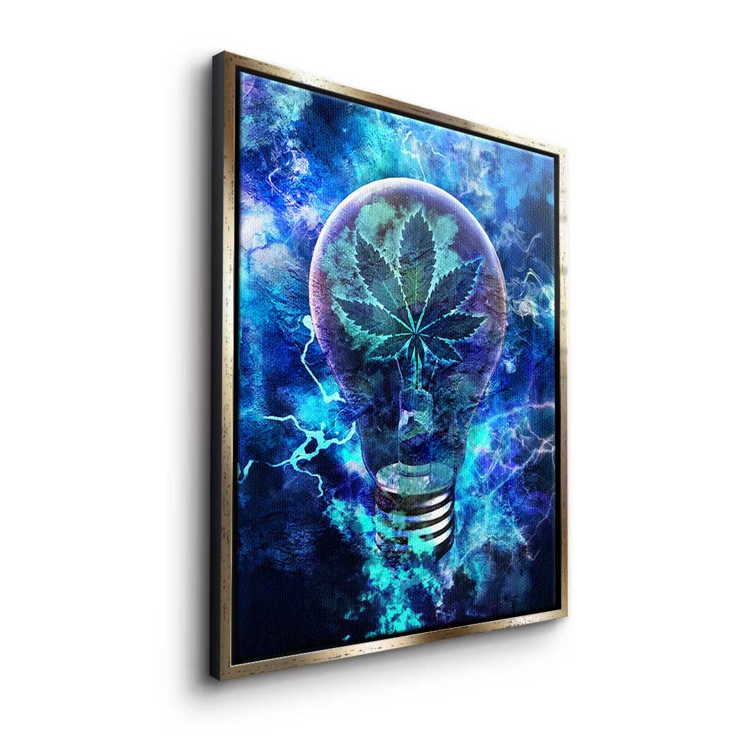 DOTCOMCANVAS® Premium canvas print in Pop Art style with lightbulb and weed leaves in blue, black and silver.